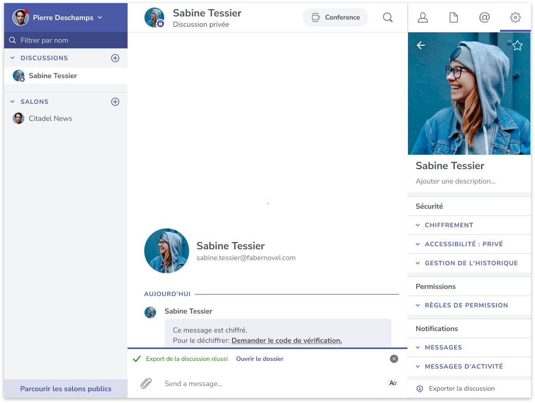 With this feature, you'll be able to export any content (messages, service messages, attachments (optional), links, etc.) from an end-to-end encrypted or non-end-to-end encrypted room/chat.