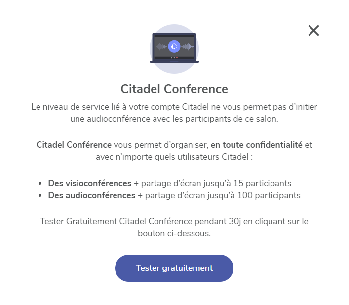 Si votre entreprise n'a pas encore souscrit à l'offre Citadel Conférence ou si vous bénéficiez d'un compte gratuit, vous pouvez la tester gratuitement pendant 30 jours en cliquant sur icônes « Conférence ».